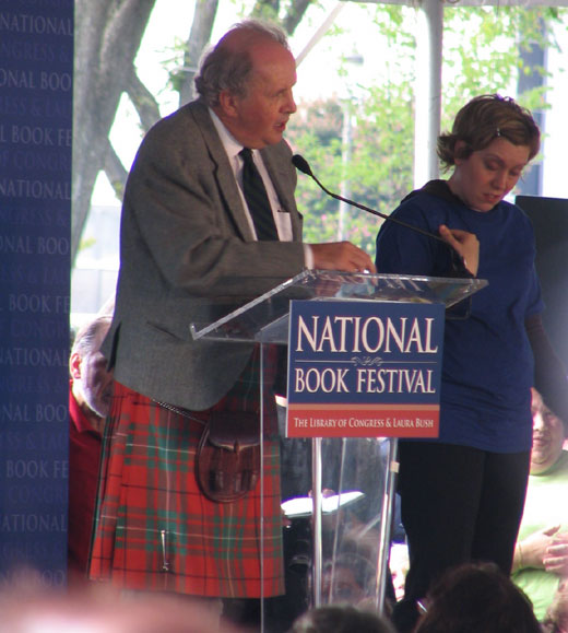 I toured a couple of other tents after he finished, passing by Mo Willems’ reading and trying to scoot into Alexander McCall Smith‘s, only to find that it was 10-people deep outside the tent and very hard to hear. But I did sneak a peek at him in his dark blazer and bright kilt and heard enough to know his latest book is another in the Sunday Philosopher’s Club series that I enjoyed earlier this year. (That’s the sign language interpreter standing next to him. This was not the best shot of her, and for that I do apologize to her.)
