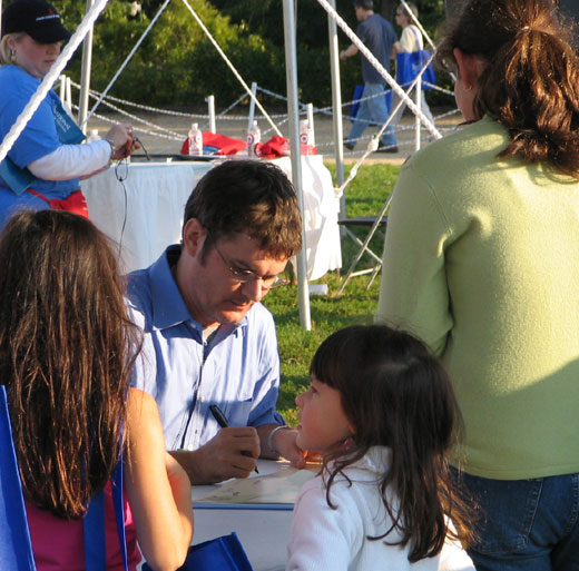 I then got at the end of the fourth line waiting for Mo Willems to get a couple of books signed. This was really the only unpleasant time of the whole day. People get grumpy when they wait in line with children. It didn’t help that this was the final signing of the day, scheduled right before dinner time, or that children who might ordinarily go down for a nap probably hadn’t had one. But their mothers became unpleasant. They harassed the young, college-aged volunteers helping keep order in the lines. They abused the festival organizers in absentia. From afar, they abused the author who had originally allowed photos but who had stopped the process once he realized he’d never get through the line that way. Never mind that his own wife and daughter were waiting for him to finish up so they could go to dinner. Never mind that he eventually agreed to stay and sign until everyone had made it through the line without restricting the number of books that could be signed.